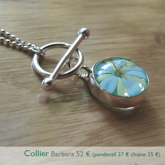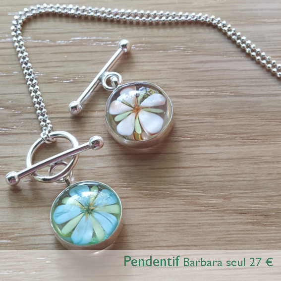 La collection Barbara est composée d'un bracelet avec fermoir en T, de deux modèles de boucles d'oreilles et d'une chaine avec un pendentif amovible. Deux types de motifs : avec des fleurs dont le montage met en valeur la transparence de la perle ou avec des perles "roc" opaques.